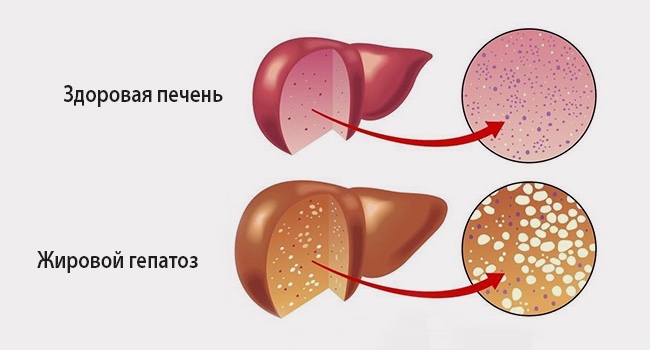 При наборе лишнего веса в организме наблюдается повышение уровня глюкозы. До какого-то момента она складируется в печени в виде гликогена. Но, когда «хранилище» переполняется (туда вмещается не более 90 г), ей ничего не остаётся, как преобразовываться в жир. Им нагружаются гепатоциты (печёночные клетки), что приводит к первым патологическим изменениям органа: