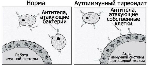 - нарушения в работе иммунной системы: её антитела ошибочно воспринимают щитовидную железу как чужеродный орган, атакуют её, внося деструктивные изменения в тироциты;