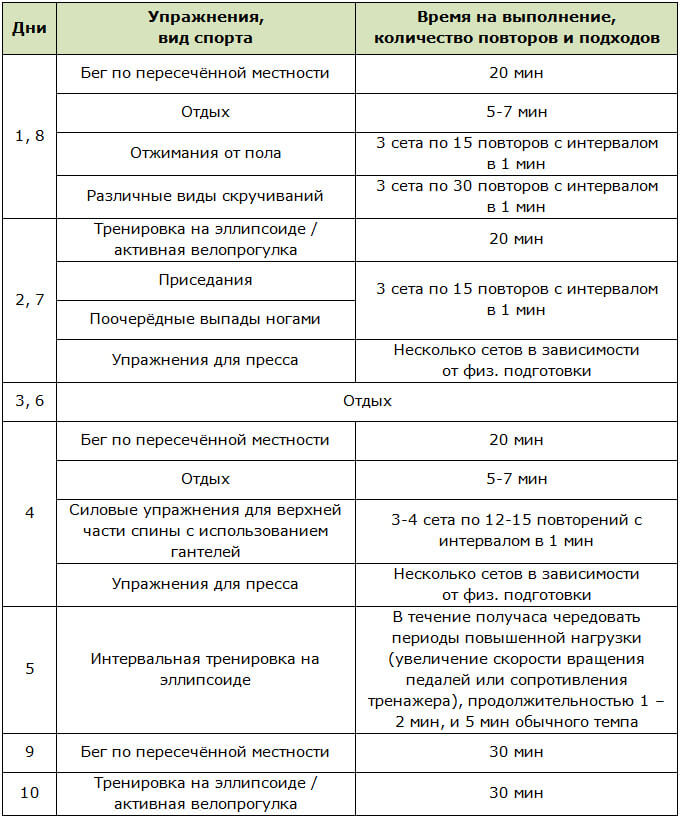 Ниже представлена одна из программ тренировок на 10 дней. Она позволяет похудеть даже без диет на 3-4 кг, а при ограничениях в питании эти цифры могут быть увеличены в 2 раза.