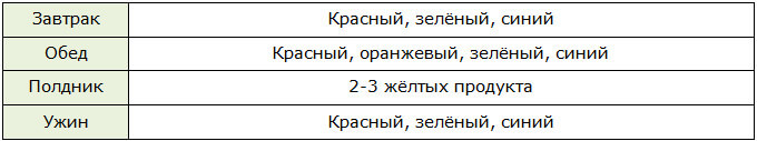 - каждый день меню должно включать продукты всех условных цветов (их 5).