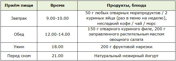 - белковый (2 недели): полный отказ от «неправильных» углеводов и вредных жиров;