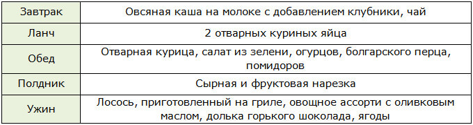 - кисломолочные продукты: ежедневно — по 200 г натурального нежирного йогурта с фруктами и ягодами, 100 г благородных ноздреватых твёрдых сыров (голландского, российского, рокфора);