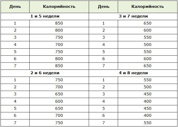 Суточная калорийность — не ниже 350 ккал и не выше 1 000. Самый облегчённый и сытный вариант диеты, рекомендованный людям: