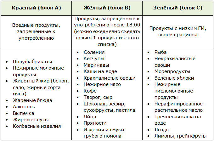 Подсчёт калорий не требуется. В основе этого варианта — категорический отказ от всех вредных продуктов. Наиболее безопасен для здоровья. Пища распределяется на световые блоки. Основные принципы: