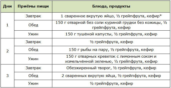 За 3 дня позволяет похудеть на 3-4 кг, считается максимально эффективной. Суточная норма калорийности не превышает 750 ккал. Есть два варианта — употреблять только этот фрукт и кефир (это лучший жиросжигающий тандем в диетологии) либо дополнять рацион белковыми продуктами (полный список), другими цитрусовыми и овощами.