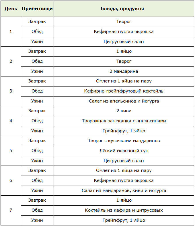 Ежедневно выпивать 600 мл лимонного сока — известного жиросжигателя. Но перед употреблением разбавлять его водой в равных пропорциях, чтобы не испортить желудок. Из твёрдых продуктов разрешены все цитрусовые, киви, ананас, яйца (не более 1 шт. в день и только сваренные вкрутую) и обезжиренные молочные продукты. Объём порций: завтрак и ужин — 100 г, обед — 200 г.