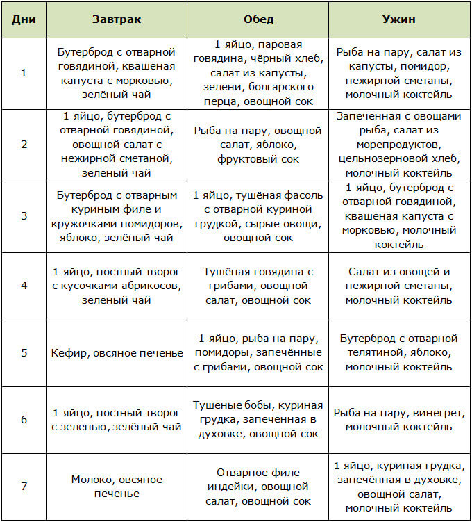 Для наглядности предлагаем ознакомиться с примерным меню белковой диеты на неделю, чтобы убедиться, что серьёзных ограничений в еде нет, но 2 кг вы потеряете гарантированно. Размер порций не указан, так как грамотная женщина знает, что при похудении из-за стола всегда нужно выходить немного голодной. Руководствуйтесь этим правилом.