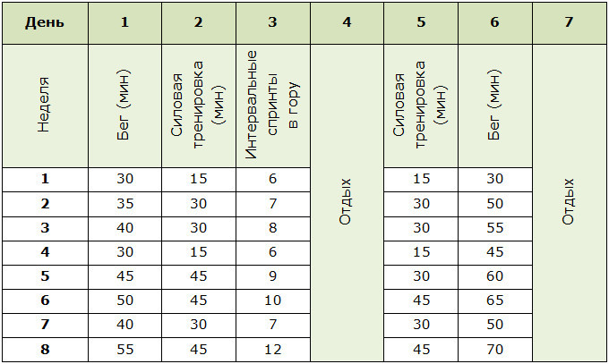 После зарядки — на пробежку: она интенсивно сжигает жир, укрепляет мышечный каркас, нормализует сердечно-сосудистую систему. Примерный план тренировок: