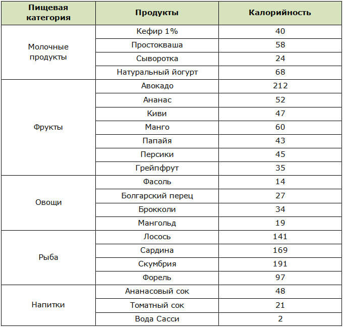 Примечание: здесь и далее — в скобках указана калорийность на 100 г продукта.