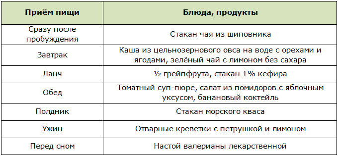 Суть: сбалансированный рацион, низкая калорийность (не более 1 500 в день), продукты, положительно влияющие на нервную систему.