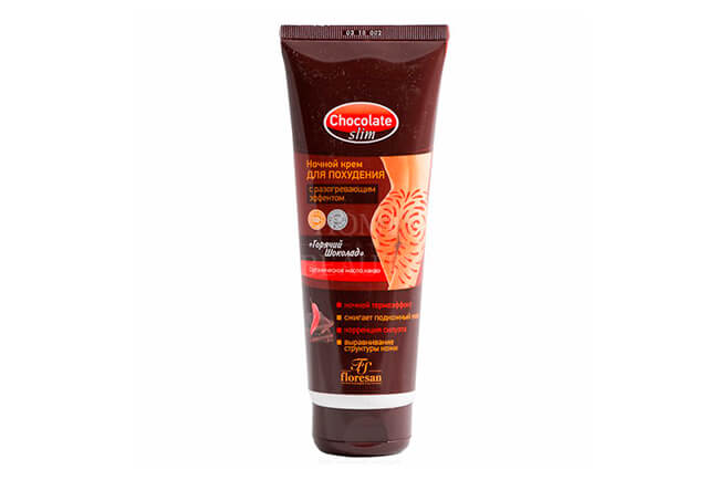 Разогревающий крем для похудения ночью. Наносится интенсивными массирующими движениями на область живота и бёдер. Состав: масла жгучего перца и какао, кофеин, экстракт перца чили.