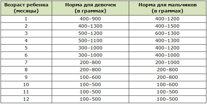 Отследить лишний вес у ребёнка до года можно по таблице: