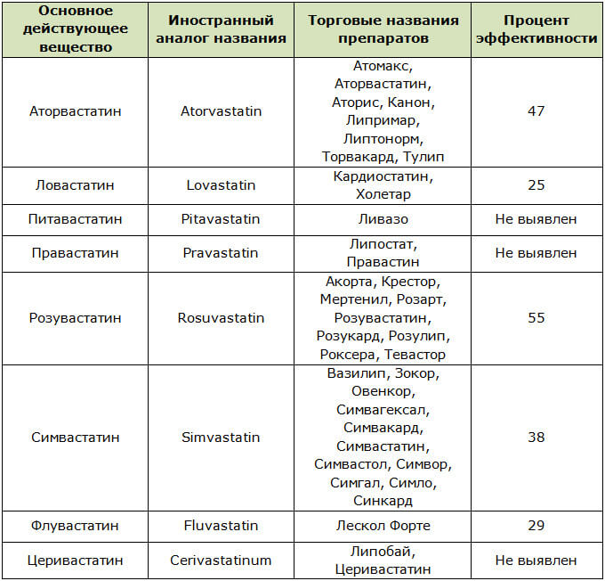 В таблице представлен перечень главных действующих веществ статинов и препаратов, разработанных на их основе, с указанием их эффективности (на сколько процентов они способны снизить уровень холестерина в крови):