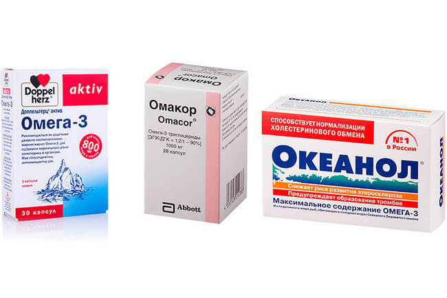 Торговые названия БАДов: Доппельгерц Омега, Омакор, Океанол. Чаще всего содержат рыбий жир. Он уменьшает риск развития ССЗ, снижает уровень холестерина, спасает от депрессии, устраняет артрит. При неправильном или слишком длительном употреблении может спровоцировать развитие панкреатита.
