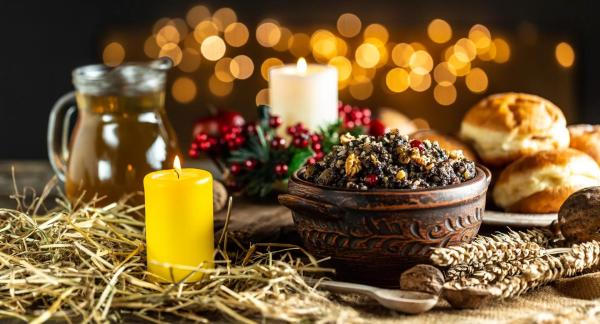 Наши предки на Рождество Христово застилали стол белоснежной скатертью. В один угол стола клали головку чеснока — считалось, что он убережет семью от болезней. В другой — мак, чтобы в доме был достаток. В третьем углу были грецкие орехи, чтобы семья была дружной, а в четвертом — яблоки, чтобы был хороший урожай. В центр же стола ставили тарелку с кутьей и свечу, которую зажигал глава семьи перед молитвой. На праздничном столе обязательно должно быть 12 блюд — они символизируют 12 апостолов и 12 месяцев.