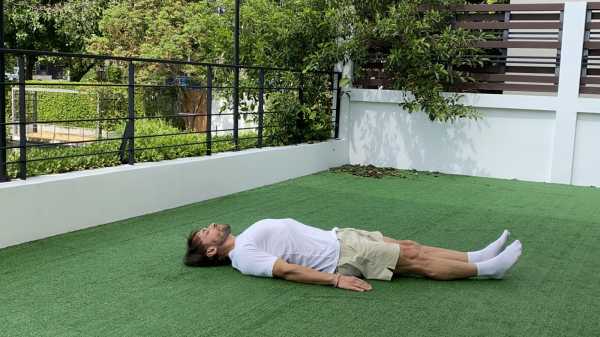 Лягте на спину с закрытыми глазами. Напрягайте мышцы всего тела (по сегментам) от 5 до 7 секунд и расслабляйтесь. Начинайте снизу вверх (стопы, голени, бедра, живот, спина, грудь, руки и лицо) Выполняем два полных круга снизу вверх.