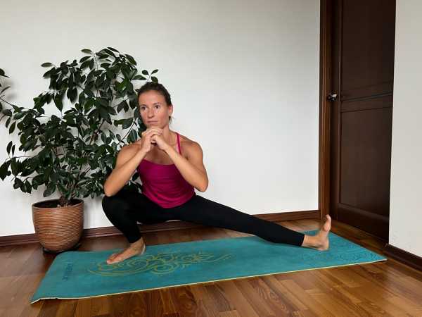 Исходное положение — стоя, ноги шире плеч, стопы развёрнуты в стороны. Выполните приседание плие. При этом следите за коленями — они должны быть направлены на ваши стопы. Не округляйте спину, смотрите перед собой. На выдохе аккуратно разверните левое бедро внутрь (выполните внутреннюю ротацию) и потянитесь левым коленом вниз. При этом таз и правая нога остаются неподвижными. На вдохе верните левую ногу в исходное положение (внешняя ротация). Повторите то же самое правой ногой. Сделайте 7-8 повторений на каждую ногу.