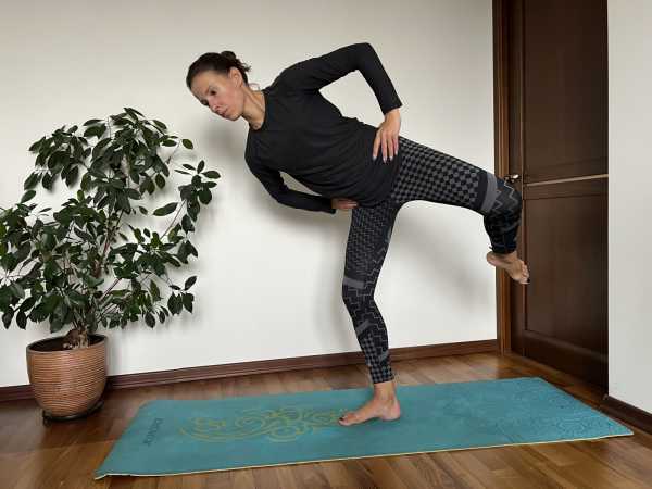 Встаньте на правую ногу и наклонитесь примерно под 45-60 градусов к полу. Опорная нога чуть согнута в колене, вес тела равномерно распределён по стопе. Нога на весу может быть немного согнута, подвздошные кости на одном уровне над полом. Подтягивайте живот, удерживайте позвоночник прямым, не округляя спину. На вдохе раскройте таз, как на фото, разворачиваясь вбок так, чтобы левая подвздошная кость оказалась выше правой, на выдохе вернитесь в исходное положение или даже опустите левую подвздошную кость ниже правой. Сделайте 15-20 повторений на каждую сторону.